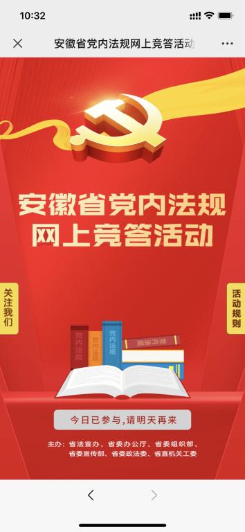 为深入贯彻落实太阳集团tcy8722总书记关于依规治党的重要论述精神,认真贯彻全国党内法规工作会议精神,切实提高支部党员干部的党内法规意识,7月4日至8日,校办公室党支部组织全体党员利用“安徽普法”微信公众平台积极参与全省党内法规知识网上竞答活动。